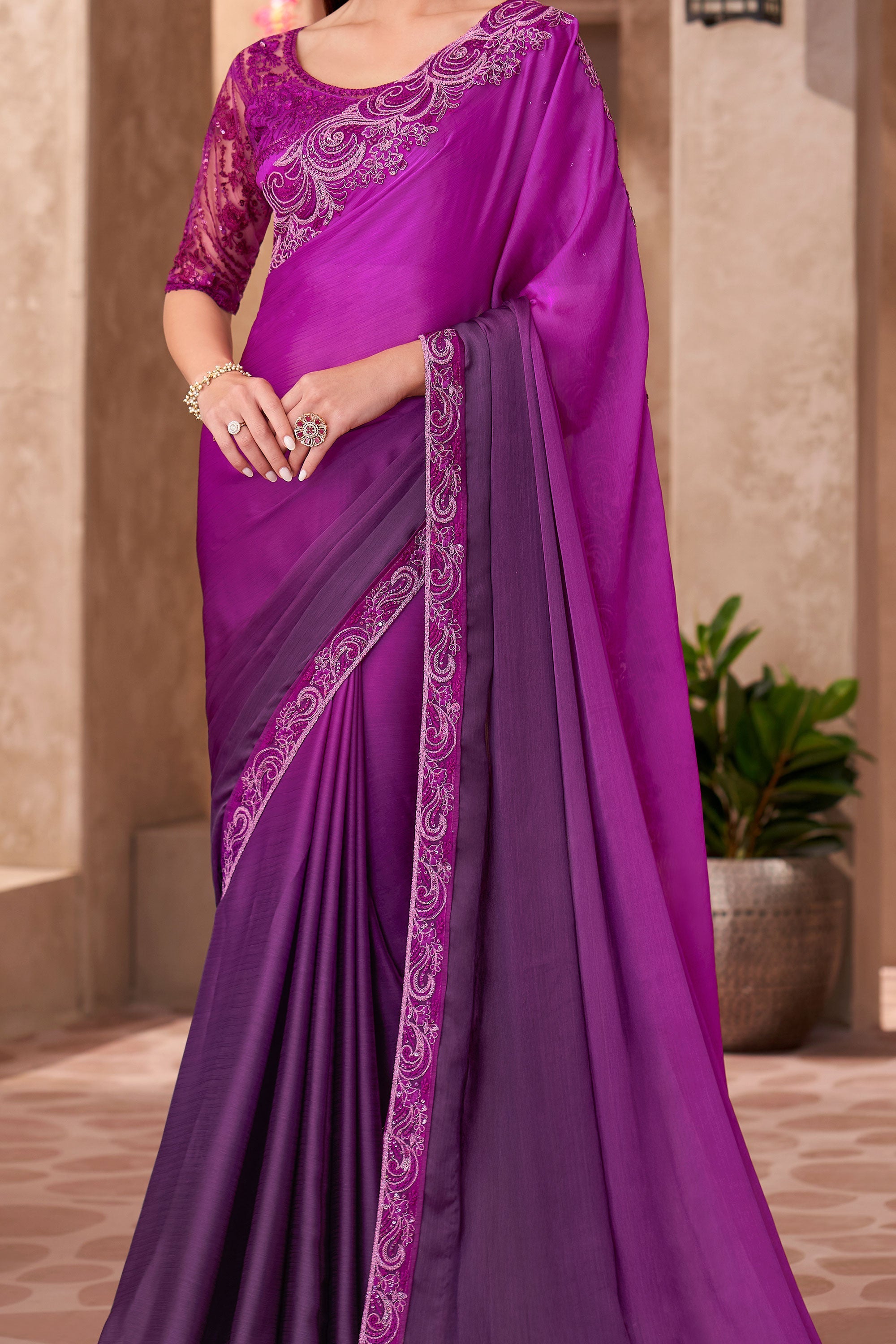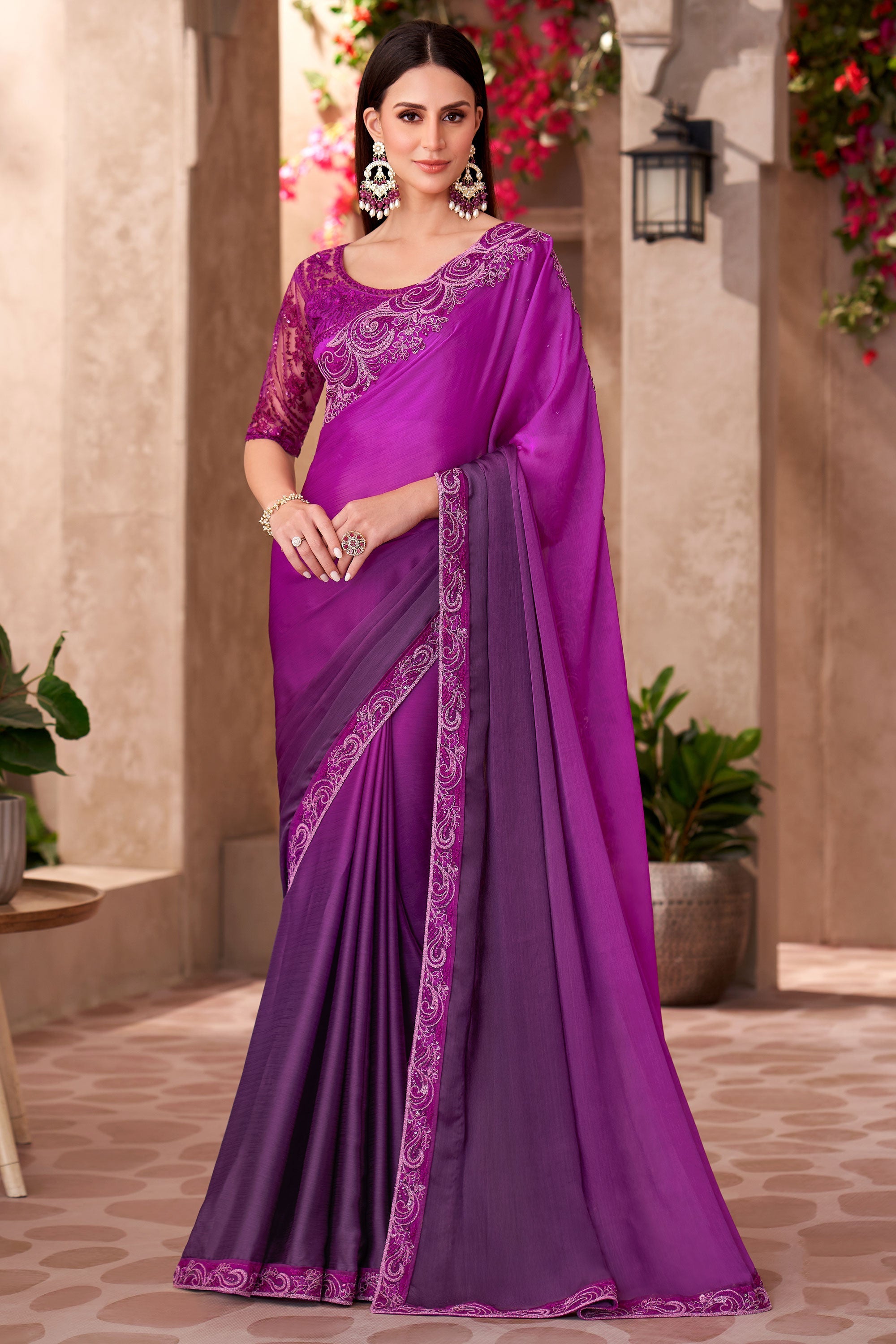 Tempting Chiffon Fabric Purple Color Saree With Border Work