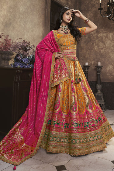 Tempting Silk Fabric Mustard Color Bridal Lehenga With Sequins Work