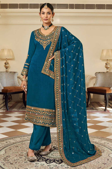 Tempting Vichitra Fabric Teal Color Pakistani Replica Suit