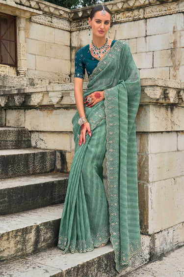 Tissue Fabric Heavy Embroidered Work Sea Green Color Phenomenal Saree