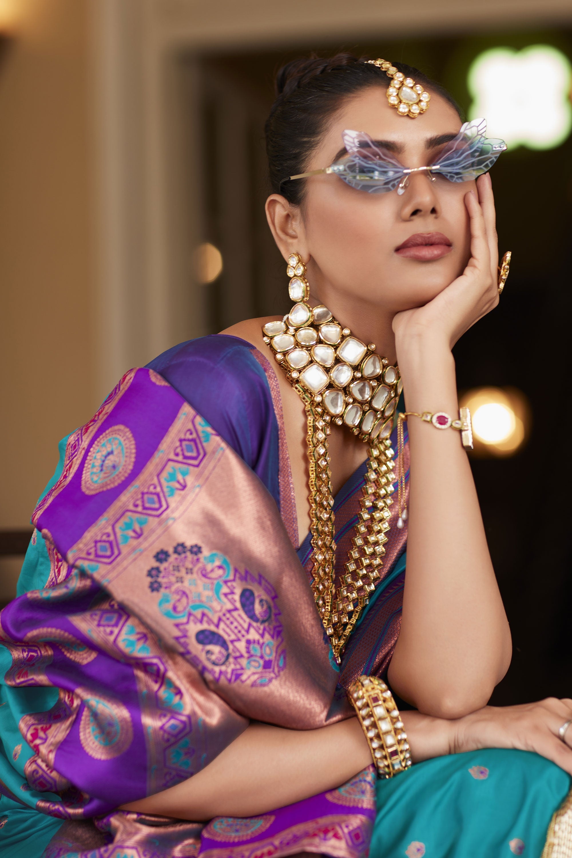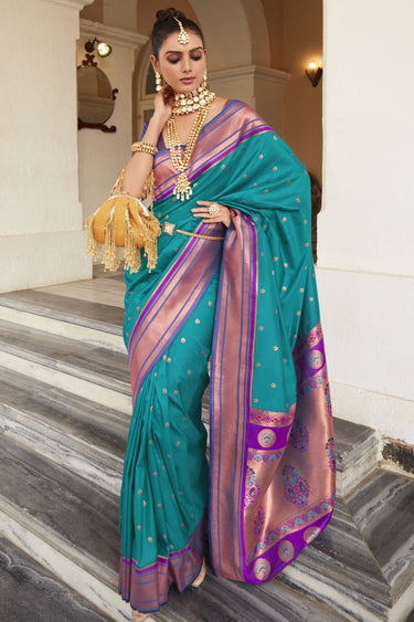 Traditional Paithani Silk Weaving Work Cyan Saree