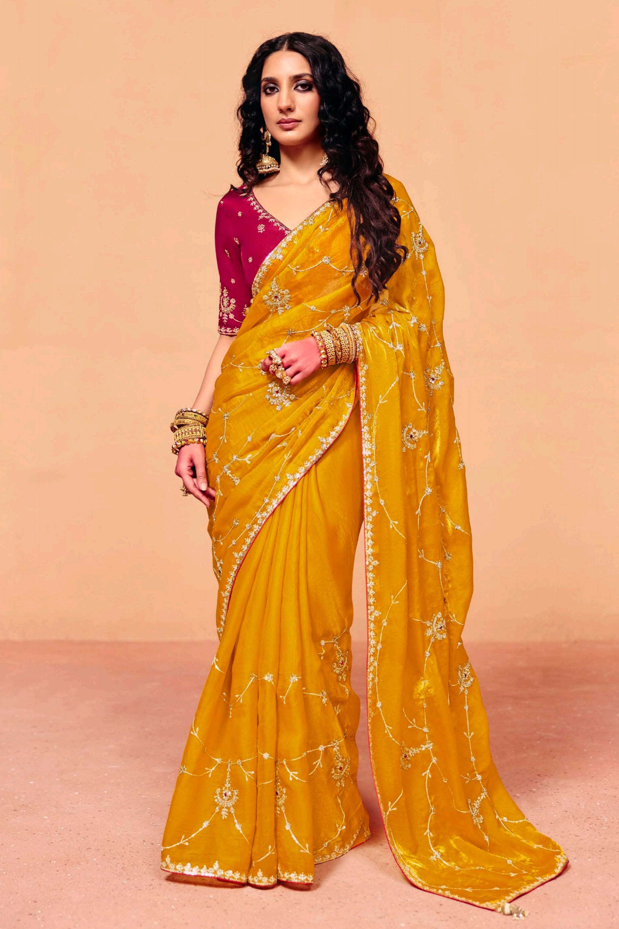 Add a touch of elegance to your ethnic wardrobe with this stunning Tissue Silk Saree, perfect for Sangeet celebrations. Designed with an intricate embroidered border, this saree captures traditional artistry in a modern style. Crafted from lightweight yet luxurious tissue silk, it offers both comfort and glamour for special occasions. Paired with an unstitched blouse, it allows you to customize the fit and design as per your preferences. Make every moment unforgettable in this gorgeous ensemble that reflects the charm of timeless craftsmanship. Ideal for weddings, festive gatherings, and cultural events, this saree is a must-have addition to your collection.
