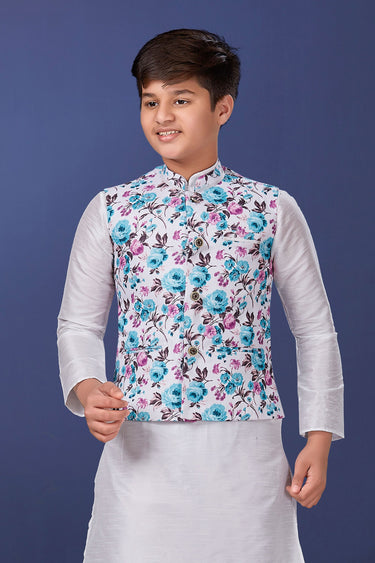 Traditional Wear Cotton Fabric Fancy Readymade Jacket For Boys In White Color