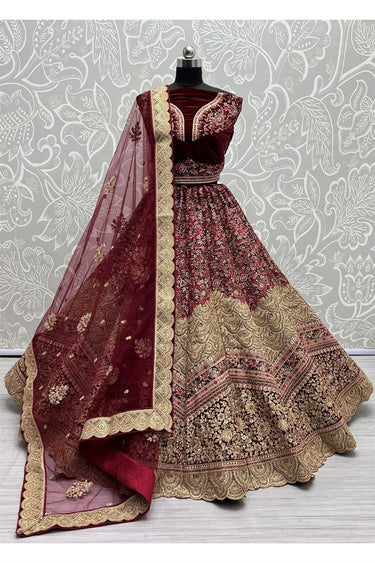 Traditional Wedding Bridal Embroidered Velvet Fabric Lehenga in Maroon Color