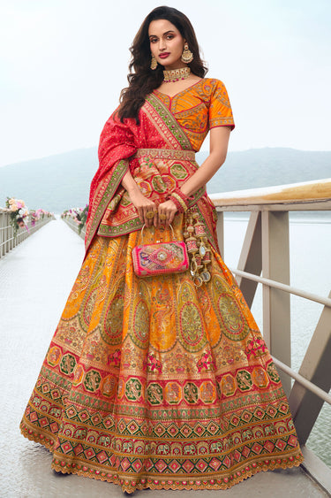 Trendy Silk Fabric Orange Color Wedding Wear Bridal Lehenga