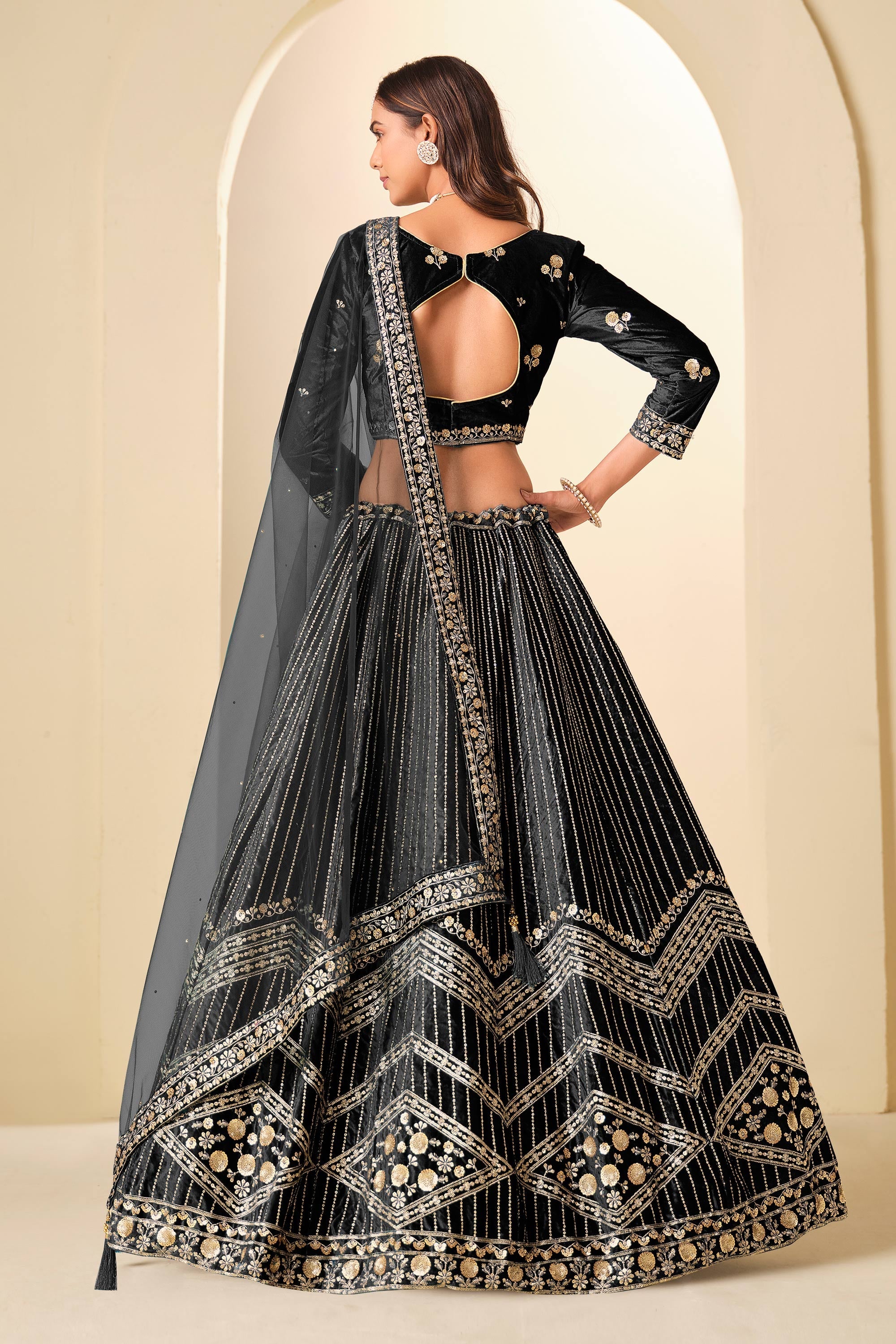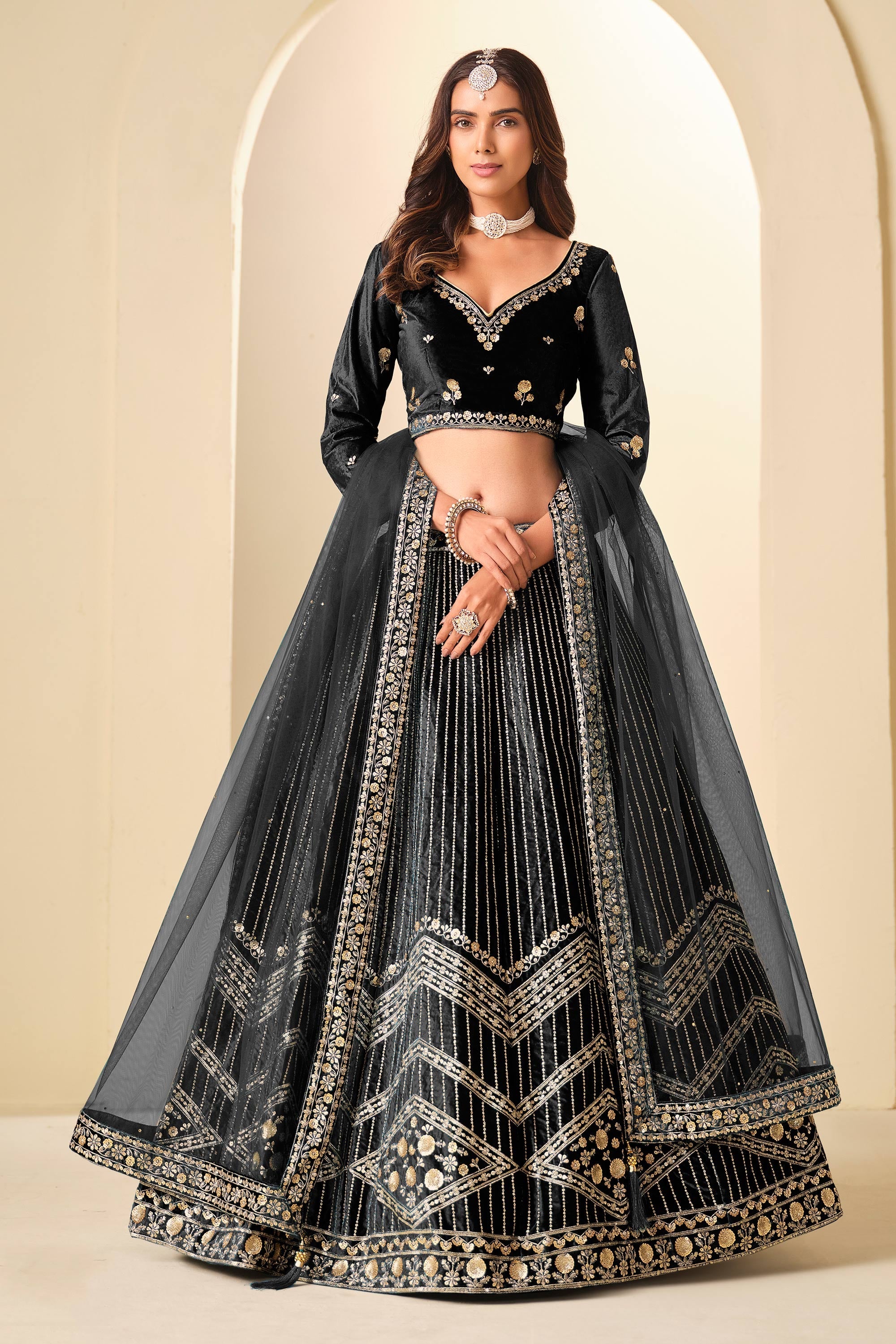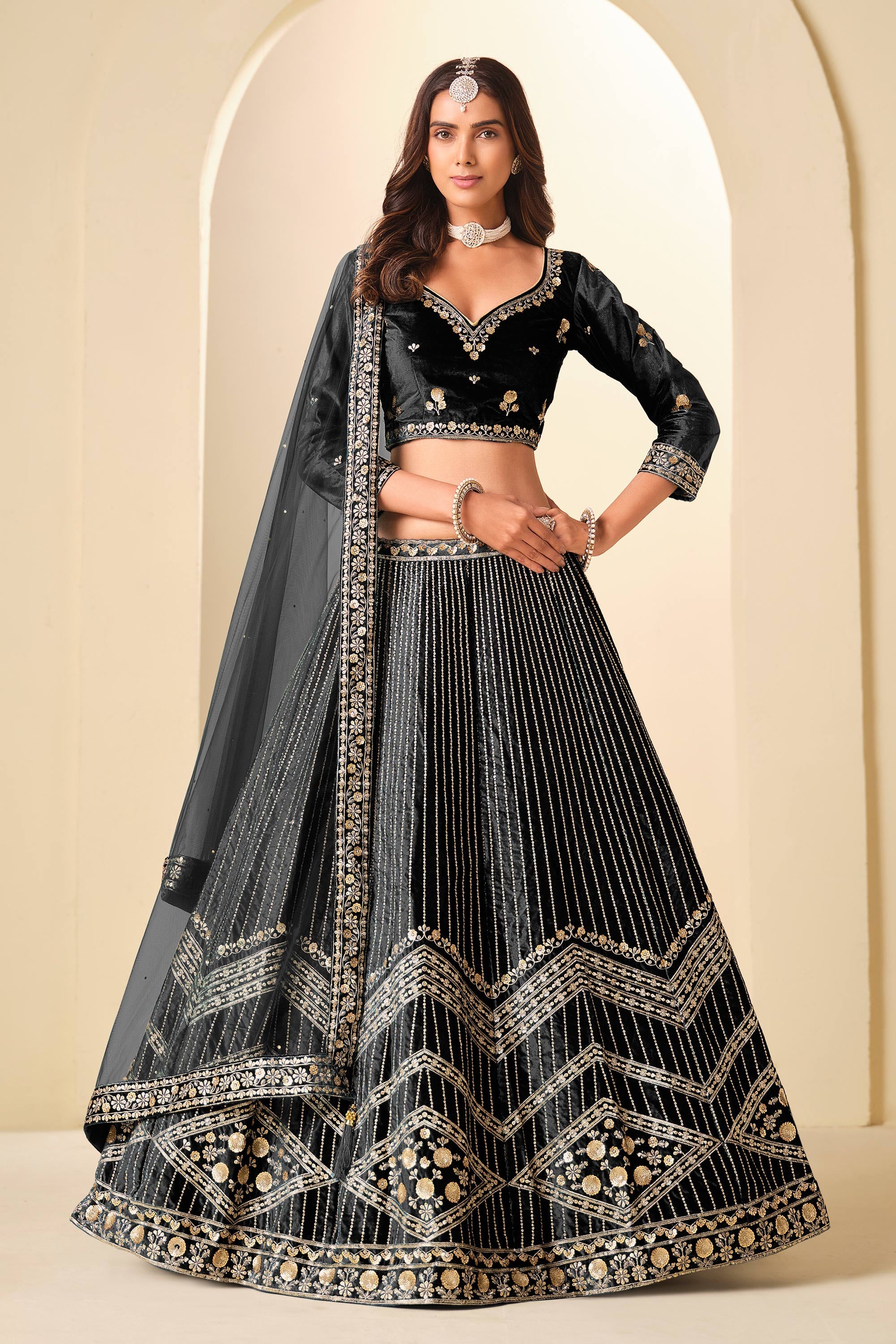 Velvet Fabric Embroidered Black Wedding Wear Lehenga Choli With Dupatta