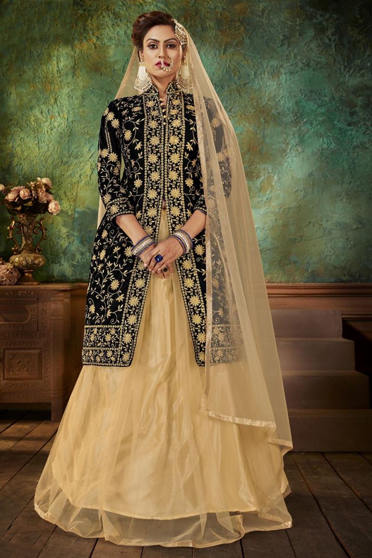 Velvet Fabric Fancy Sangeet Wear Embroidered Black Sharara Top Lehenga