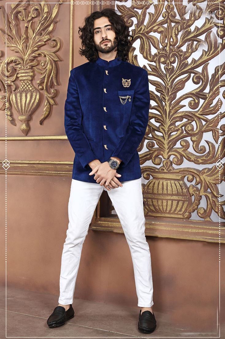 Velvet Fabric Navy Blue Color Wedding Wear Jodhpuri Suit