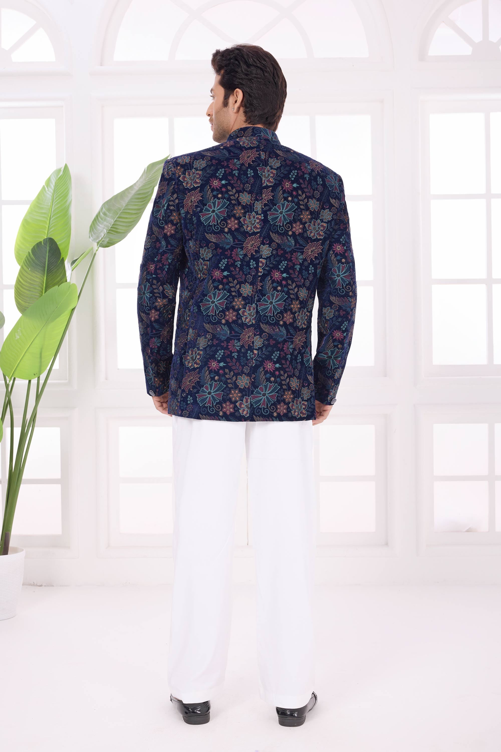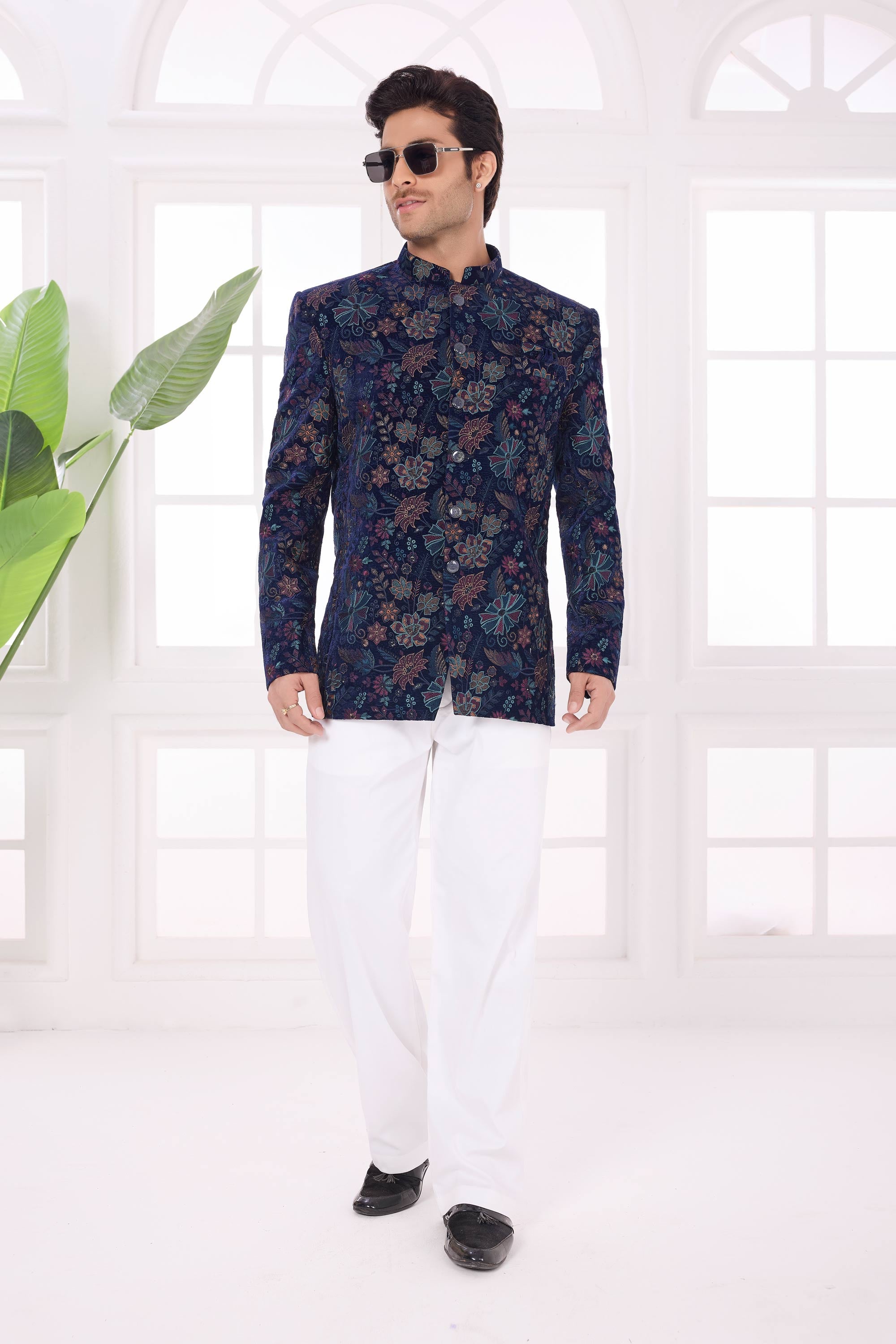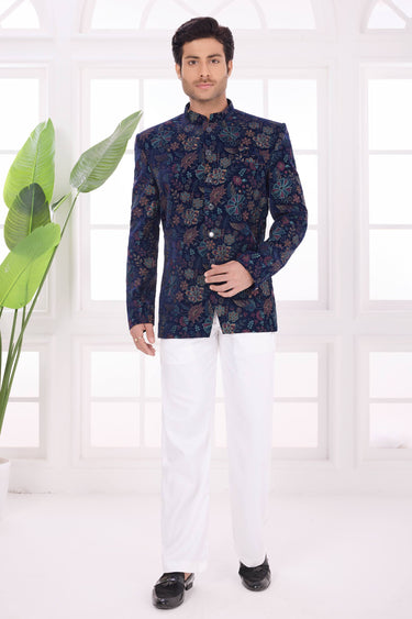 Velvet Fabric Navy Blue Readymade Jodhpuri Jacket For Wedding Wear