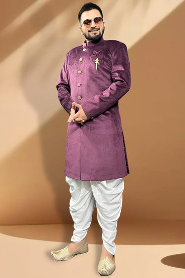 Velvet Fabric Wine Color Wedding Wear Readymade Peshawari Style Indo Western For Men