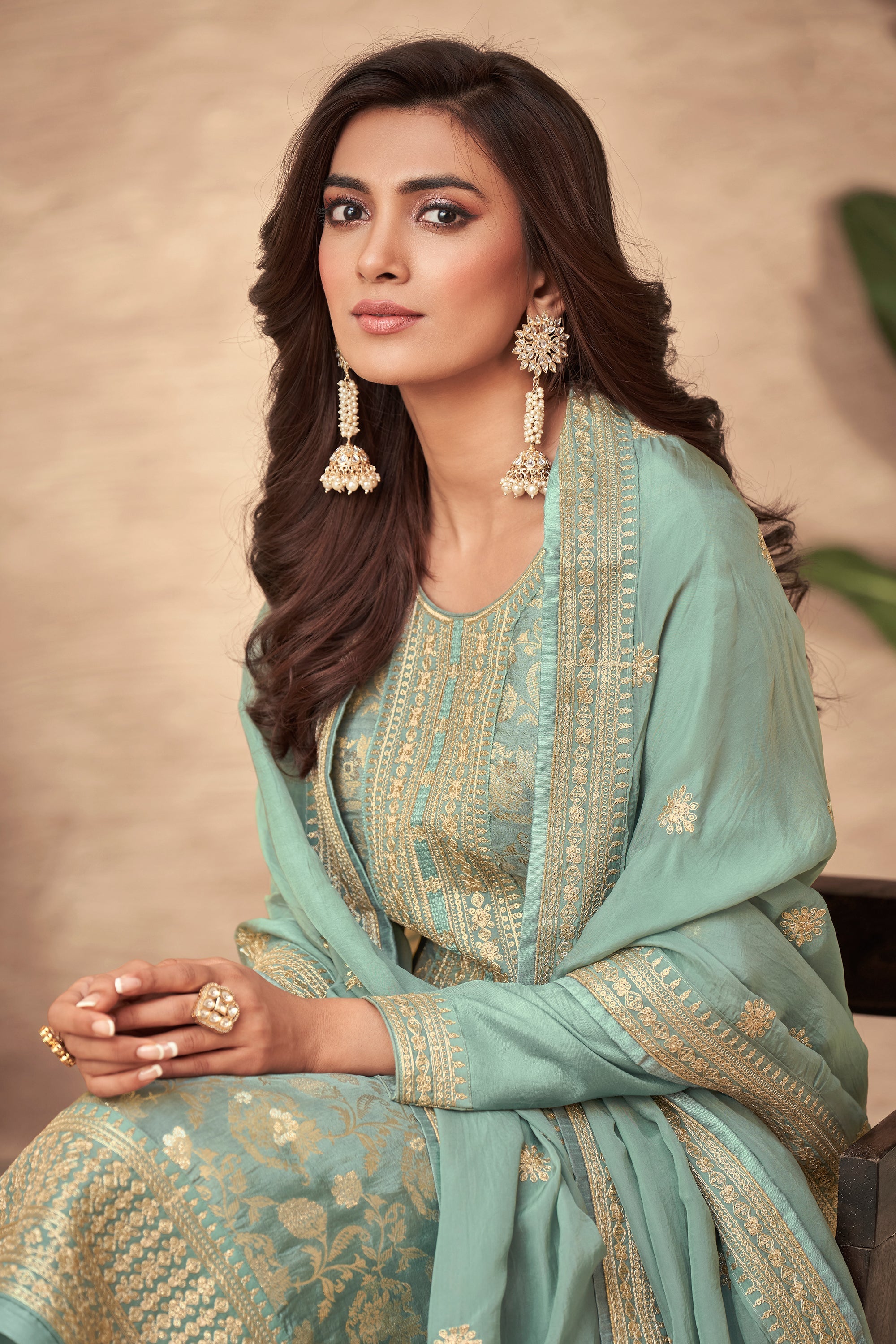 Viscose Fabric Embroidered Function Wear Long Straight Cut Salwar Suit In Cyan Color