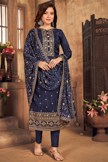 Viscose Fabric Festive Wear Navy Blue Embroidered Straight Cut Suit