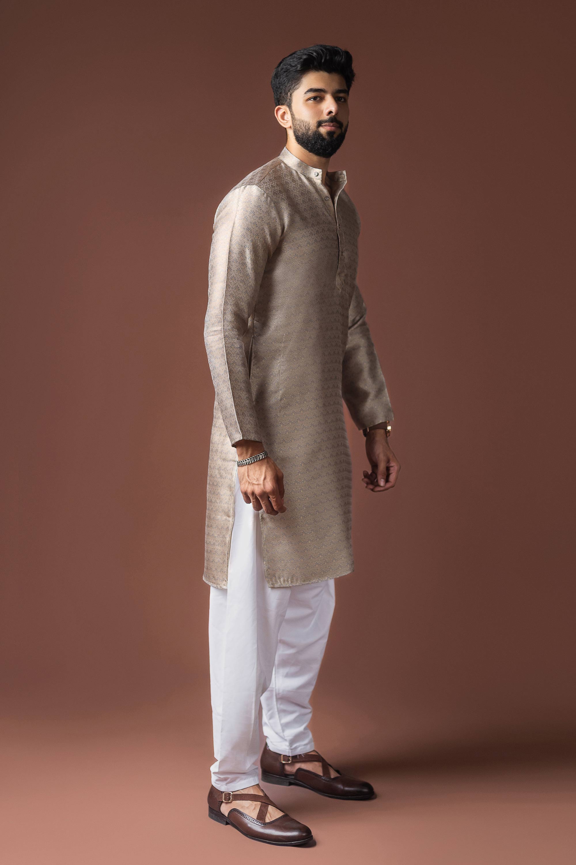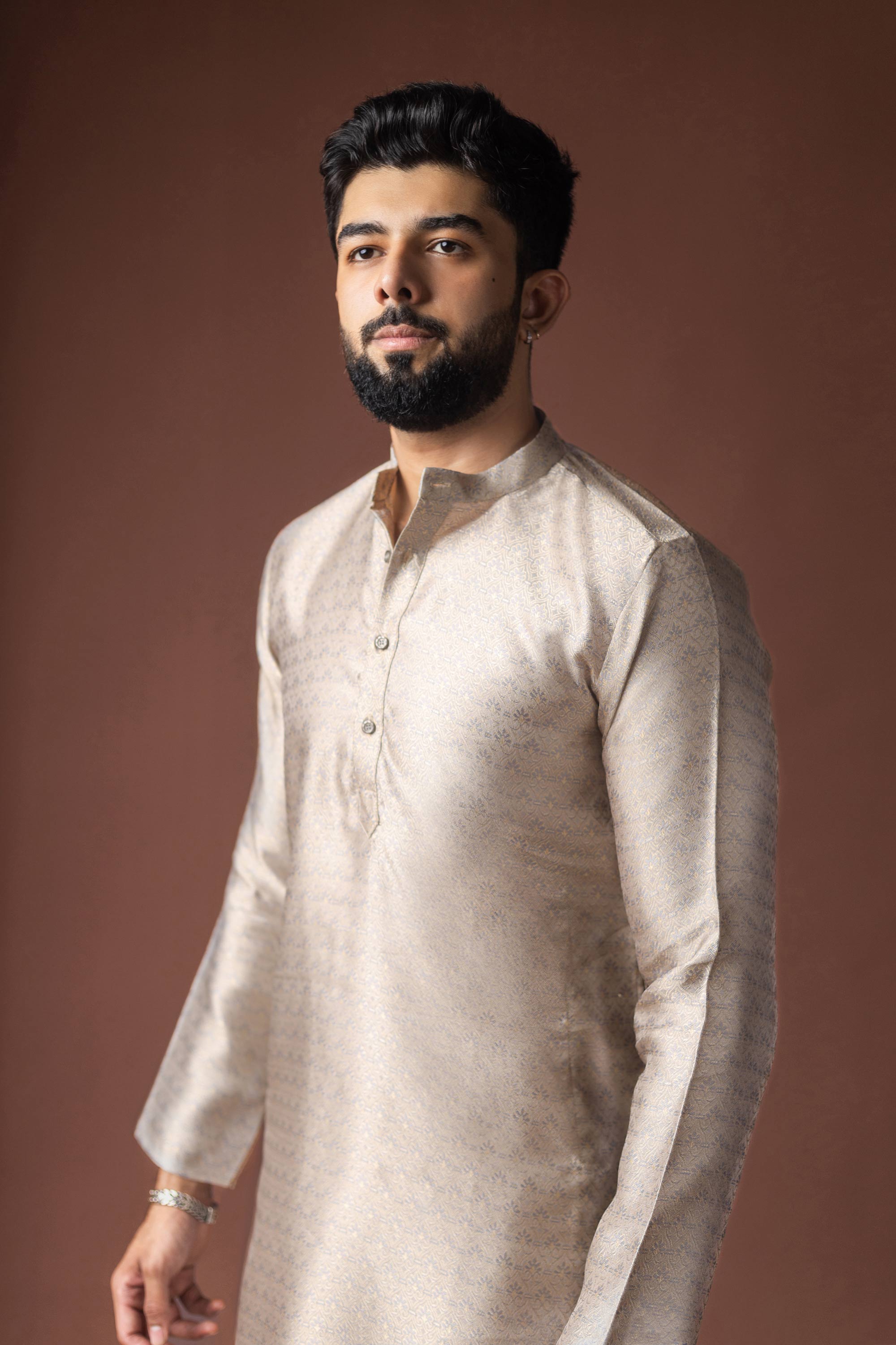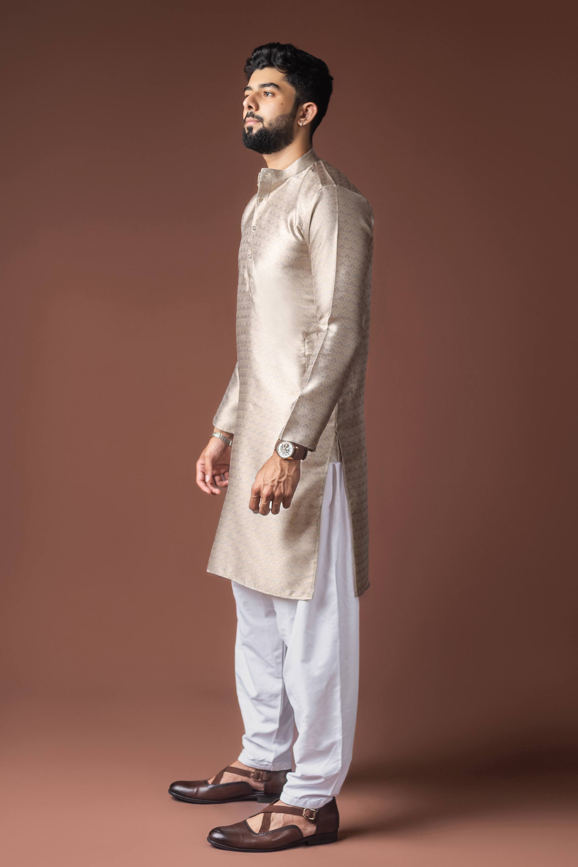 Weaving Work Beige Jacquard Wedding Wear Readymade Kurta For Men