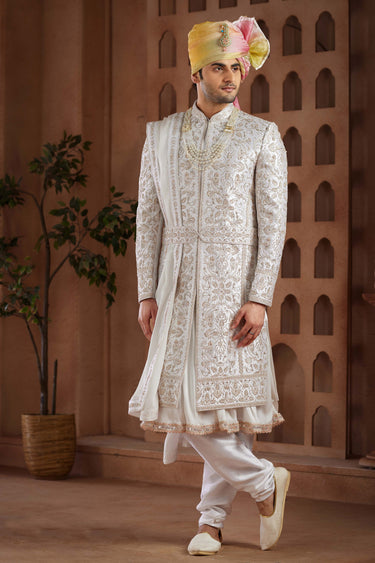 Wedding Wear Art Silk Fabric Designer Heavy Embroidered Readymade Groom Sherwani For Men In White Color