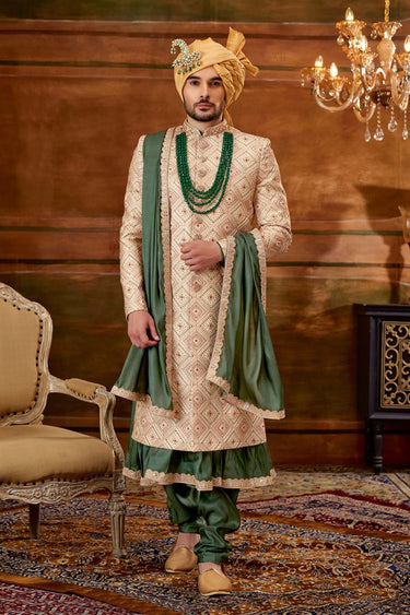 Wedding Wear Attractive Heavy Embroidered Groom Sherwani For Men In Cream Color Silk Fabric With Stole