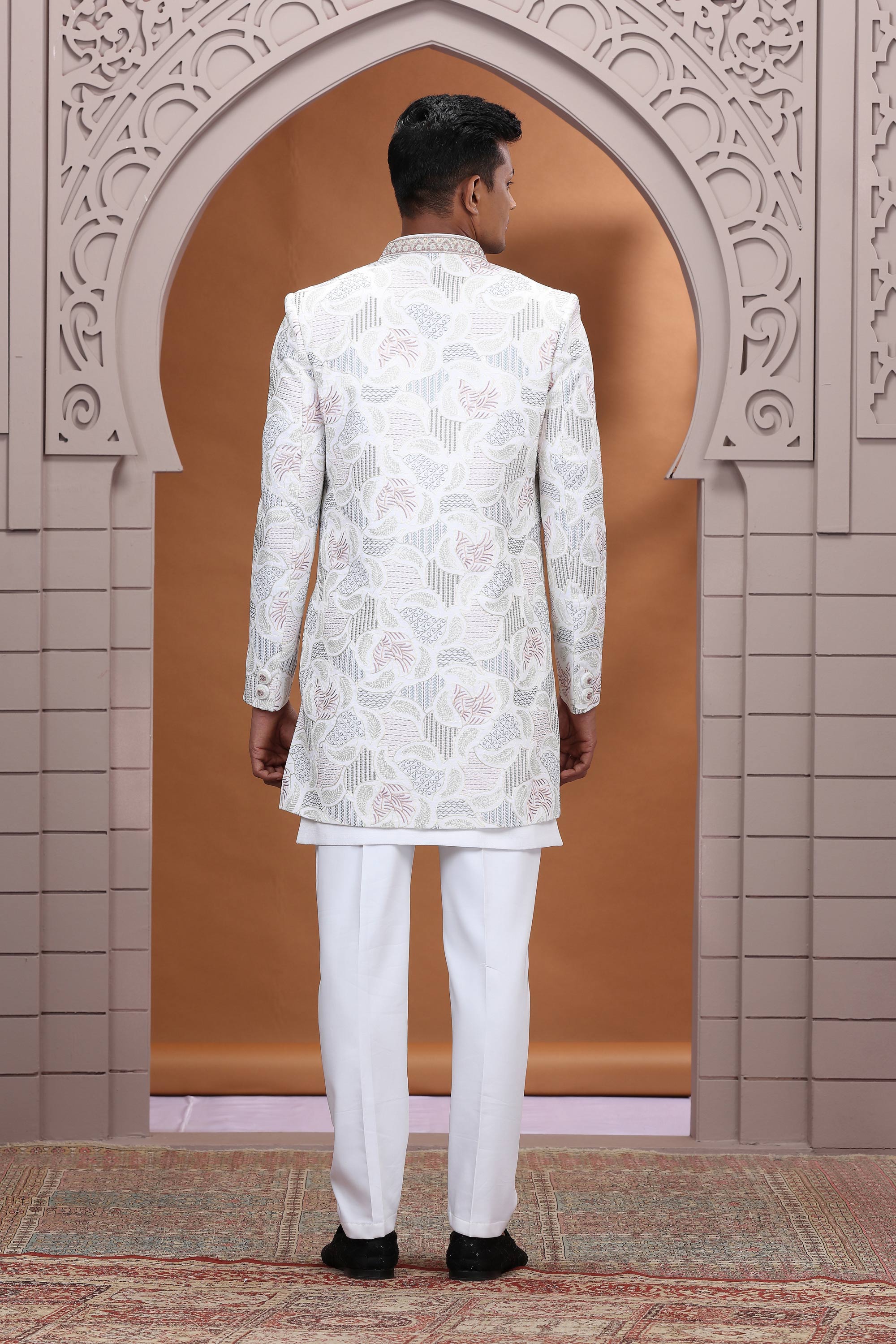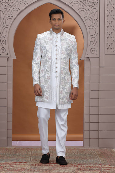 White Art Silk Fabric Readymade 3 Piece Indo Western For Men