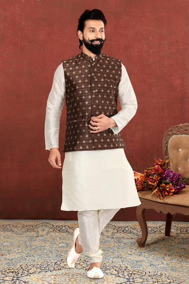 White Color Engaging Dhupion Silk Fabric Festive Wear Readymade Kurta Pyjama For Men With Jacket