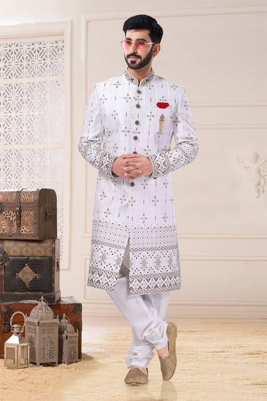 White Color Silk Fabric Wedding Wear Readymade Sherwani For Men