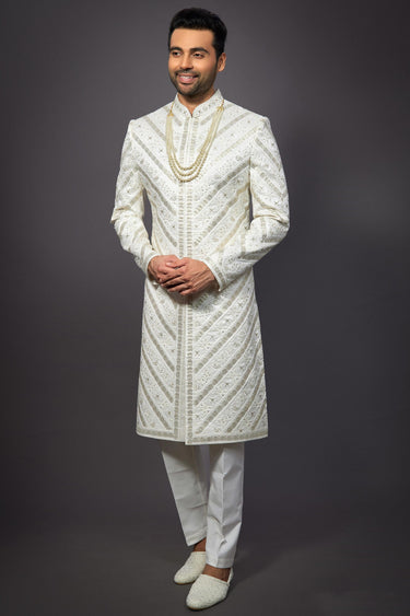 White Color Wedding Wear Silk Fabric Designer Readymade Indo Western For Men