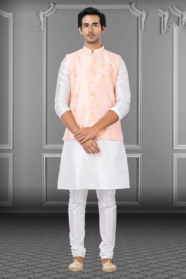 White Dhupion Raw Silk Fabric Function Wear Readymade Kurta Pyjama For Men With 3 Pcs Jacket Set