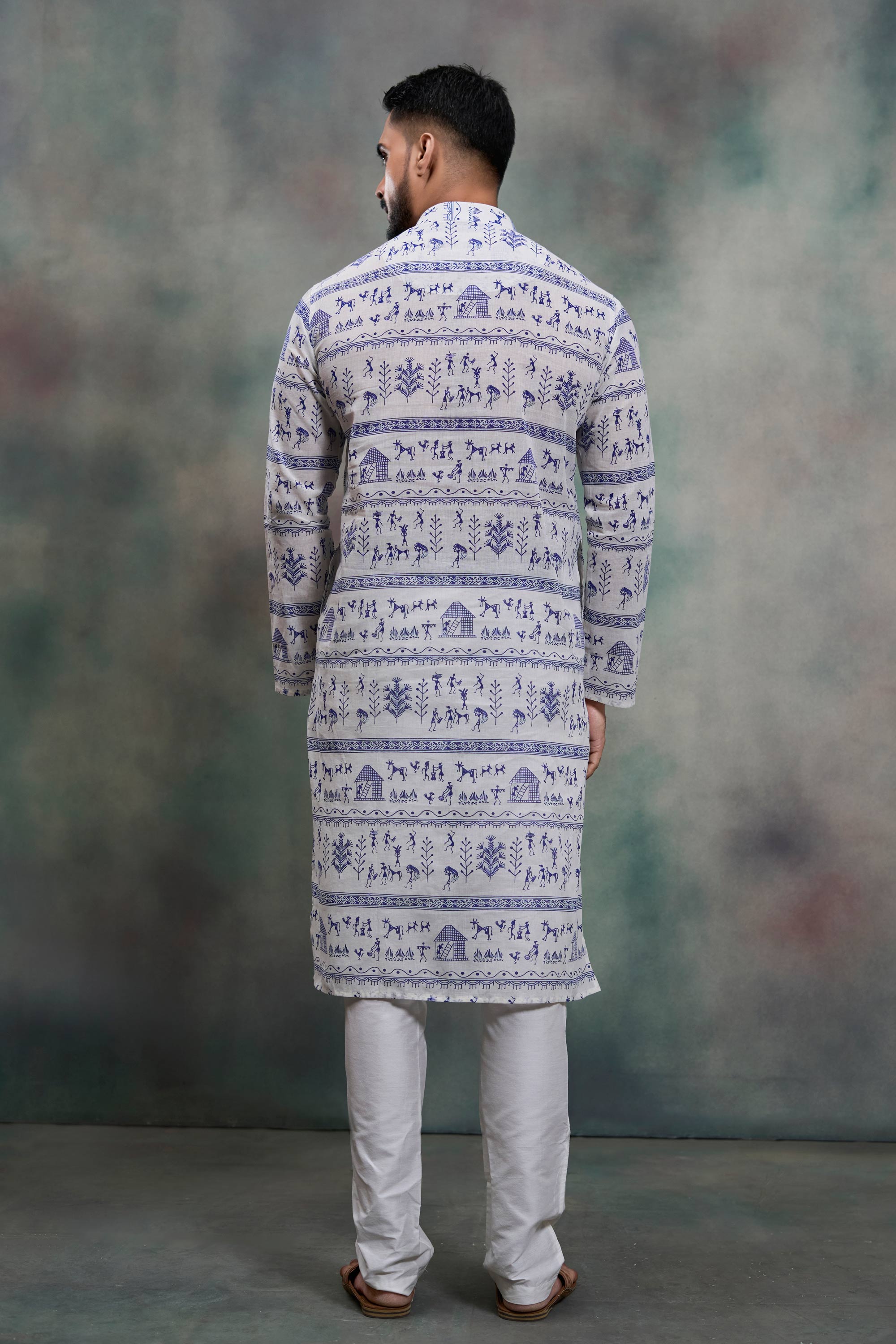 White Festive Wear Printed Fancy Fabric Readymade Kurta Pyjama For Men