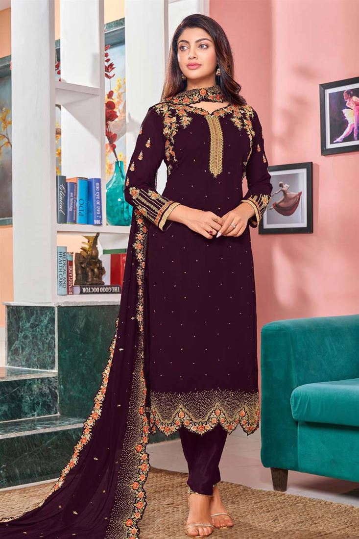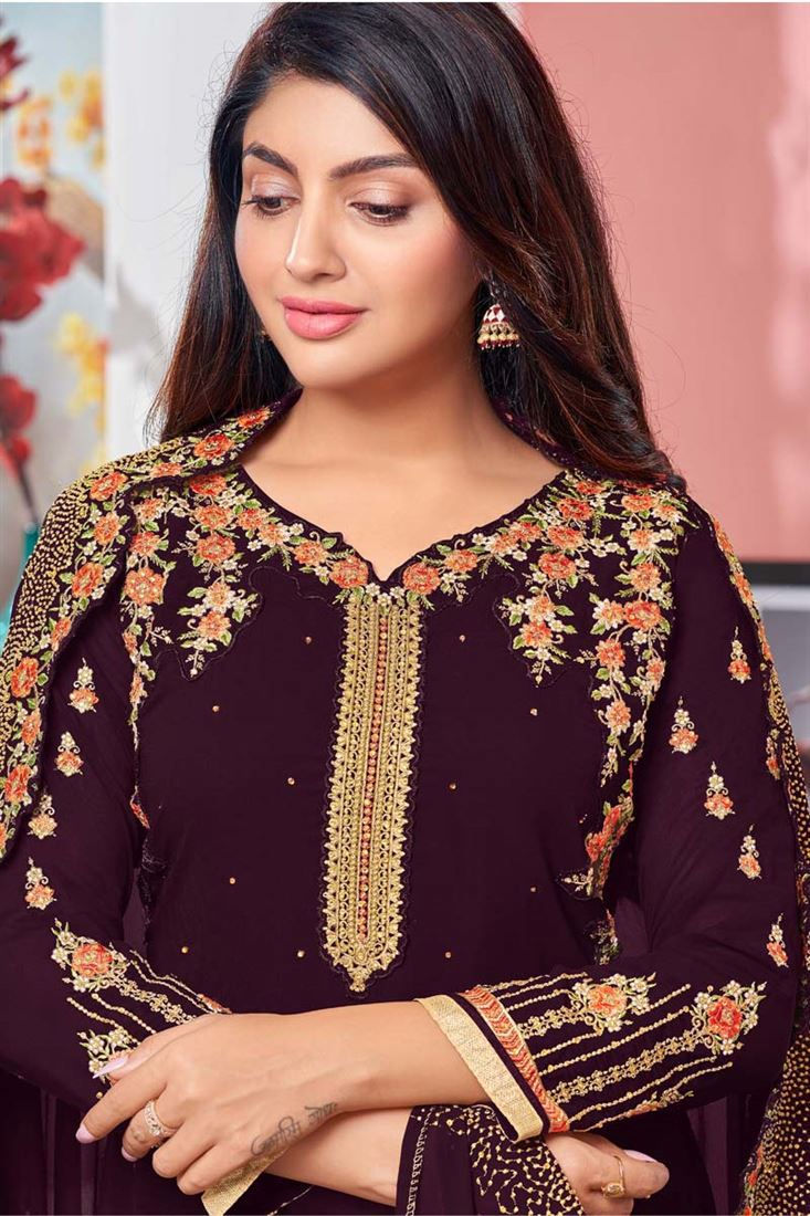 Wine Color Embroidered Designs On Georgette Fabric Party Wear Pleasance Salwar Suit Featuring Akanksha Puri
