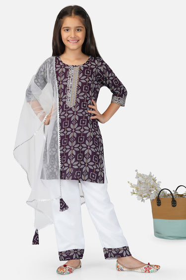 Capture the richness of tradition in the sophisticated form of our wine-colored, Cotton Fabric, Readymade Stylish Kids Salwar Kameez. Showcasing an attractive print, this outfit elevates your child's style quotient at any gathering. Its comfortable and breathable material, ideal for all body types, allows for effortless movement. Crafted with durability, comfort, and no-fade color, it ensures your kid’s clothing lasts longer, retaining its premium look through countless occasions. Give your child a standout appearance with our stylish Salwar Kameez!
