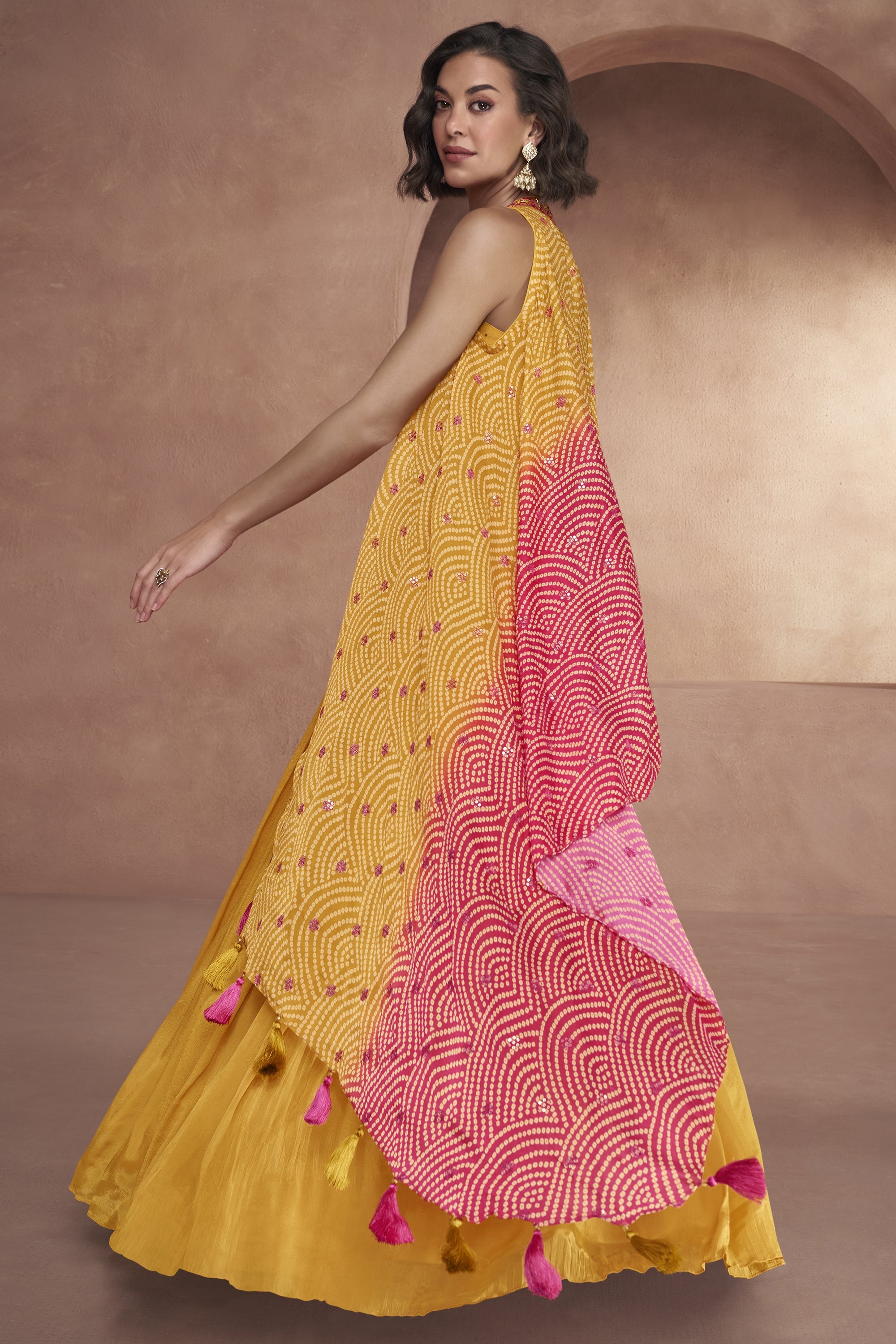 Get ready to turn heads in the Reach Art Silk Sangeet Wear 3 Piece Readymade Lehenga. This beautiful ensemble includes a premium silk lehenga skirt, a net or chinon dupatta, and an intricately embroidered blouse that sparkles and shines. The fabric is carefully crafted to ensure that it drapes elegantly around your curves, while the embroidery adds a touch of sophistication and glamour to any event you attend. With its can-can design, the skirt gives you plenty of volume so that you feel like a true princess as you twirl around on the dance floor. The free size stitching makes this lehenga suitable for anyone regardless of their shape or size. Whether you're getting ready for your sangeet ceremony or another special occasion, this readymade lehenga has got everything you need to look and feel amazing. Don't wait any longer! Add it to your wardrobe today!