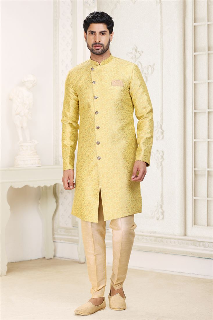 Yellow Banarasi Jacquard Fabric Graceful Readymade Men Indo Western For Wedding Wear