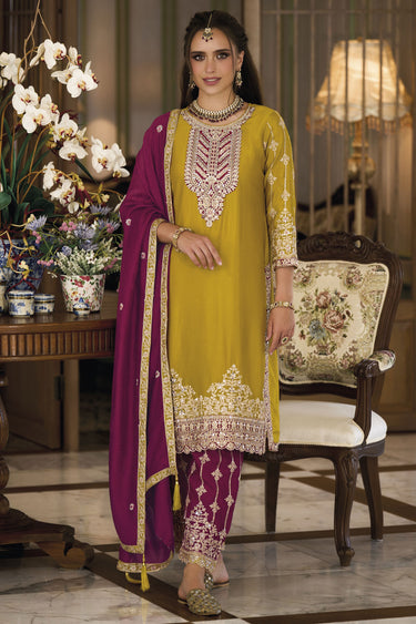 Yellow Color Embroidered Art Silk Fabric Readymade Designer Salwar Kameez