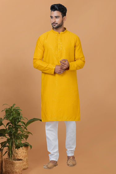 Yellow Color Lovely Sequins Embroidery Readymade Kurta Pyjama For Men