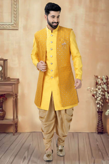 Yellow Color Silk Fabric Wedding Wear Readymade Indo Western For Men