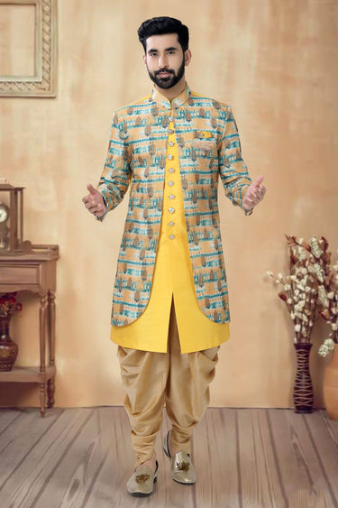 Yellow Color Wedding Wear Readymade Silk Fabric Indo Western For Men