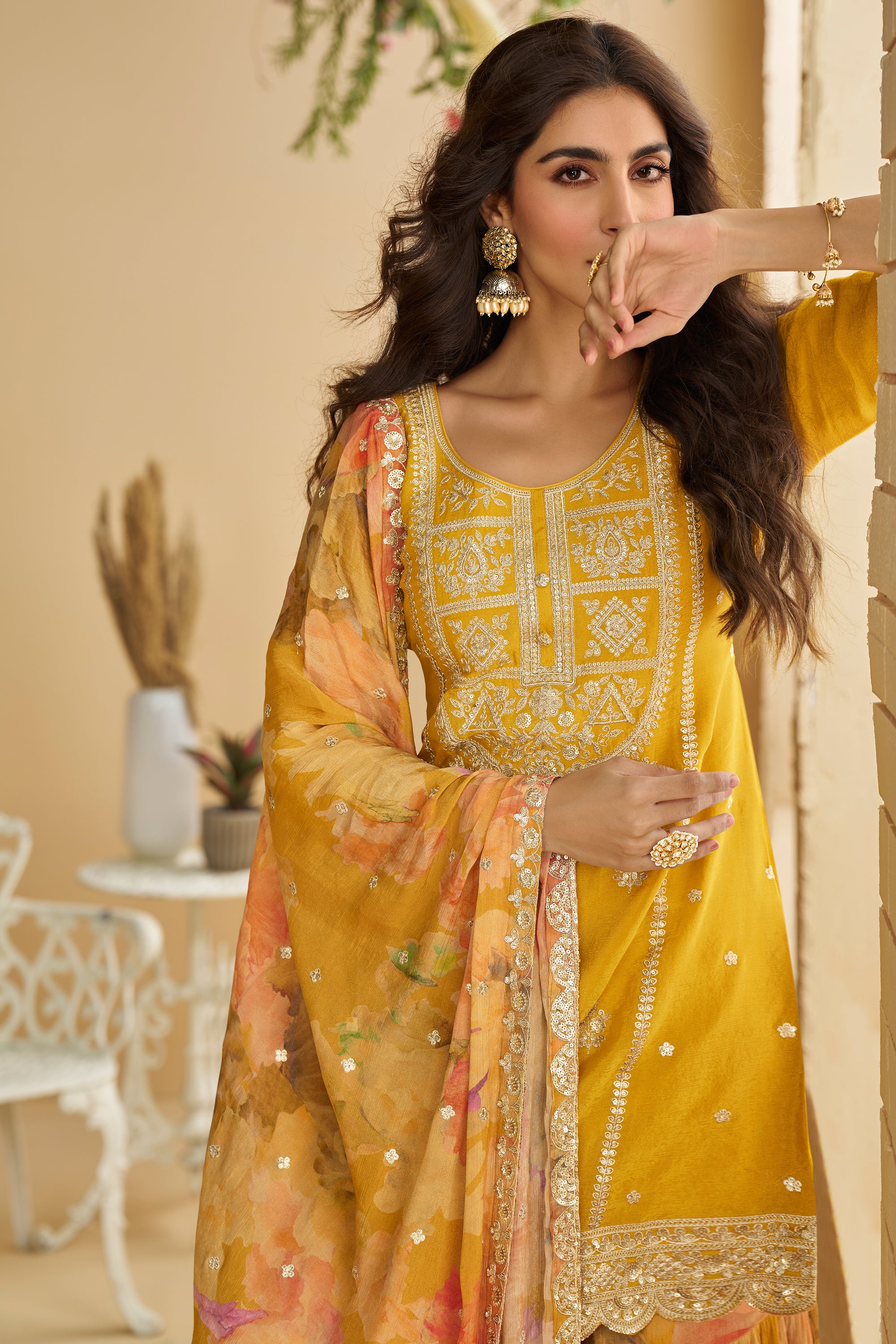 Upgrade your wardrobe with this stunning Womens Embroidered Chinon Silk Readymade Palazzo Suit With Dupatta. Designed with elegant embroidery, this premium Chinon Silk suit brings together style and comfort. The set includes a ready-to-wear palazzo suit that fits perfectly and a matching dupatta to complete the traditional yet chic look. Perfect for festive occasions, weddings, or formal gatherings, this outfit offers a rich and timeless appeal. Crafted with attention to detail, the soft fabric ensures breathability and a graceful fit. Pair it with your favorite accessories to enhance the overall elegance and create a lasting impression.