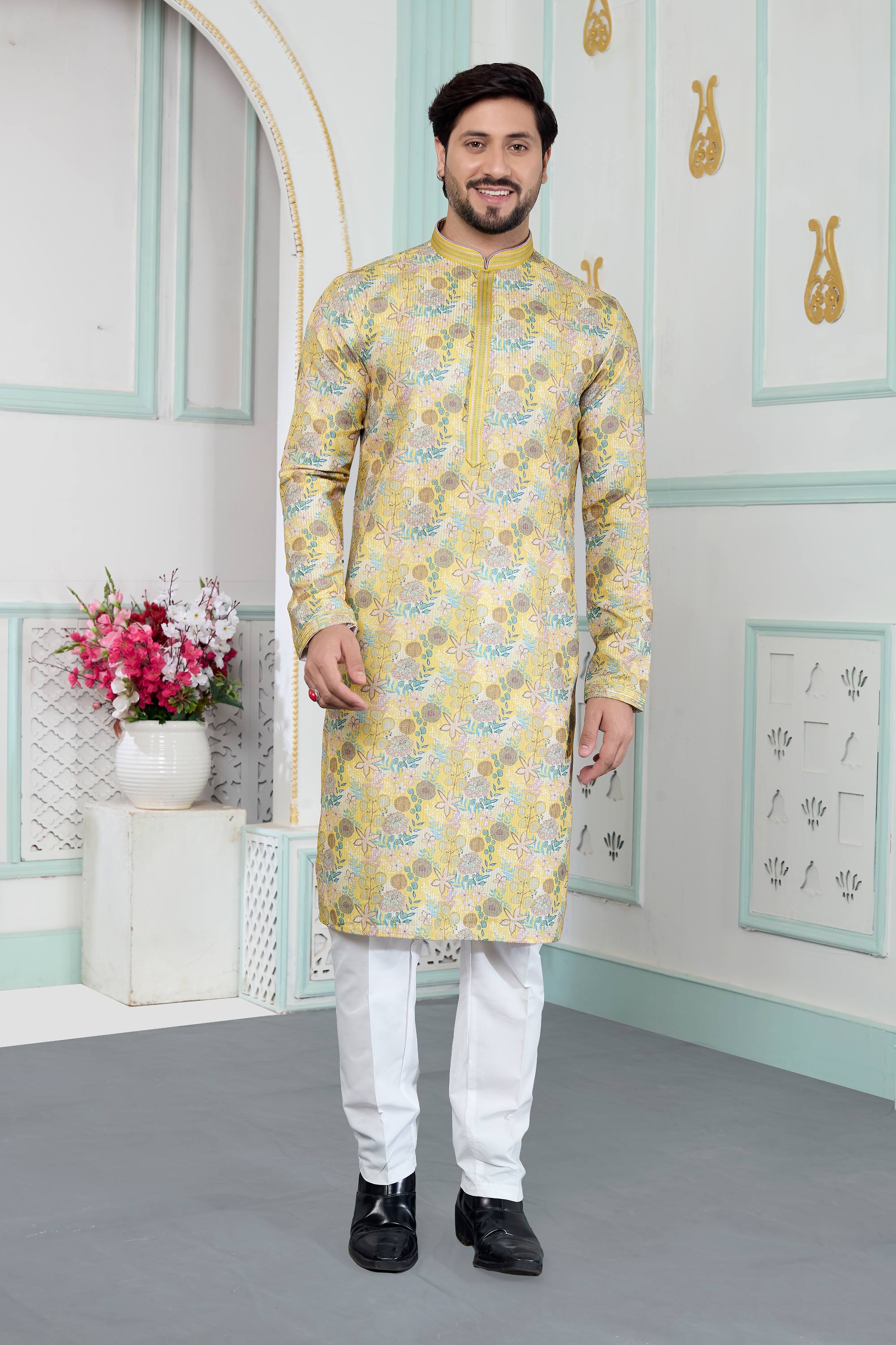 Yellow Festive Wear Art Silk Readymade Kurta Pyjama For Men